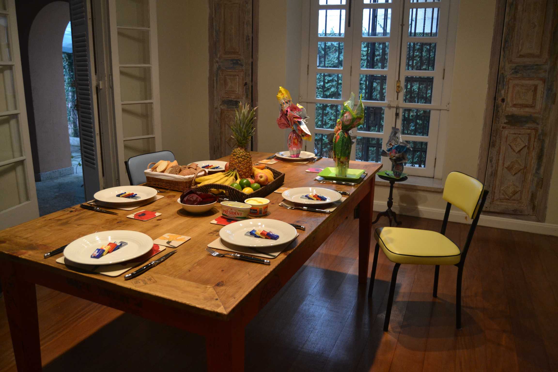 Easter dinner at the De Vries home (they are still waiting for their furniture shipment). You can see 3 of the Easter Egg gifts.